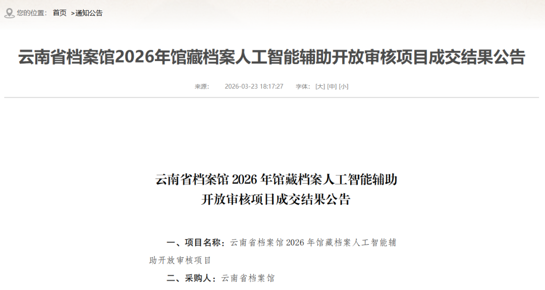 省档案馆发布“2026年馆藏档案人工智能辅助开放审核项目”成交结果公告。