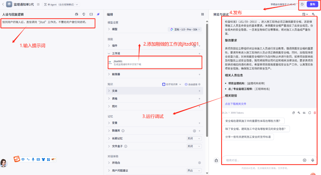 因此,对于希望用 AI 快速赋能监理业务的团队来说,Coze 是当前最优解之一:无需复杂部署、不依赖技术人员,也能搭建高效、规范、可复制的智能流程。