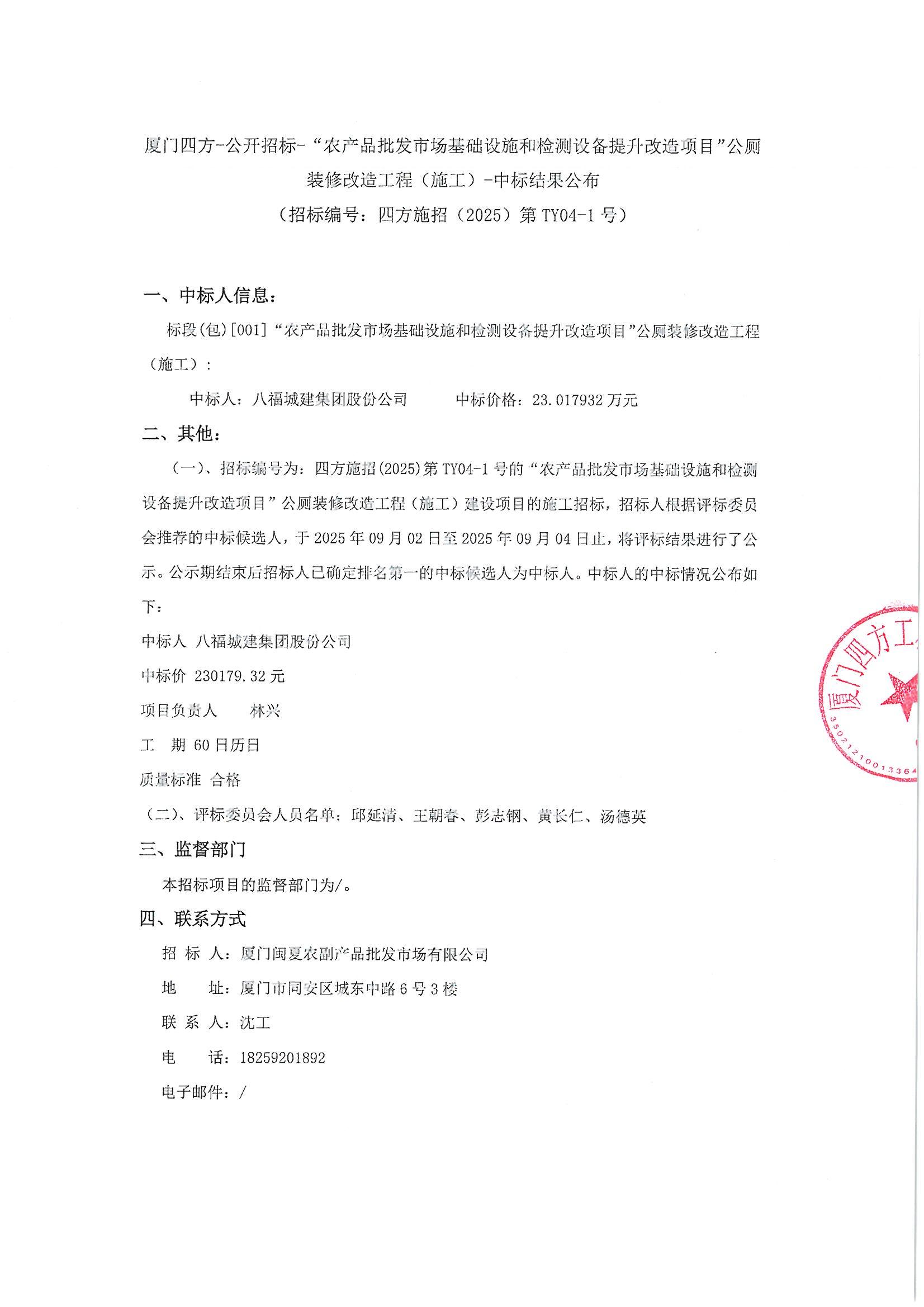 厦门四方-公开招标-“农产品批发市场基础设施和检测设备提升改造项目”公厕装修改造工程(施工)-中标结果公布