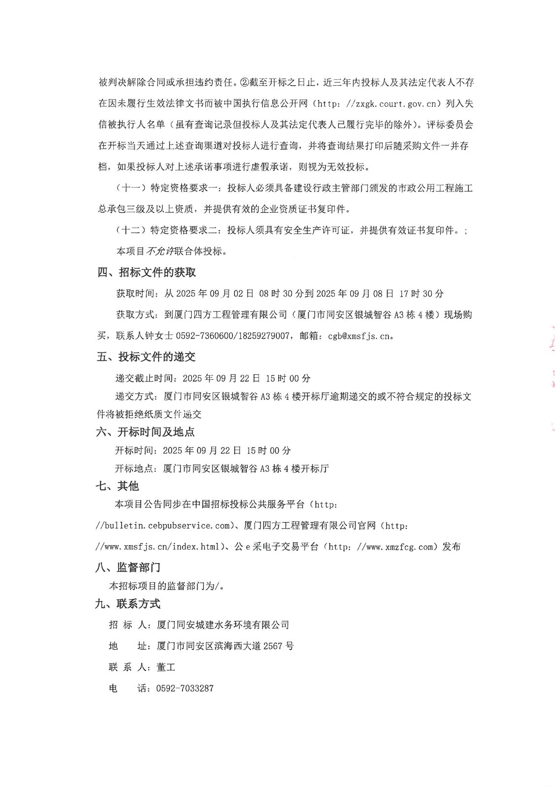 厦门四方-四方采购招【2025】gk03号-公开招标-同安区2025-2026年雨污水管网抢修服务招标公告