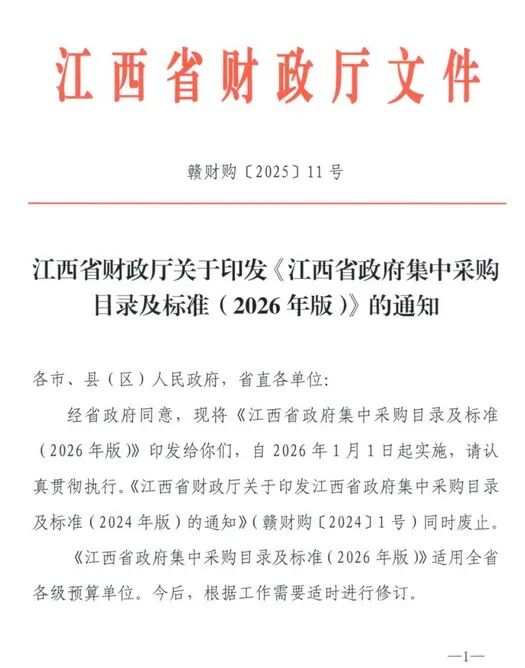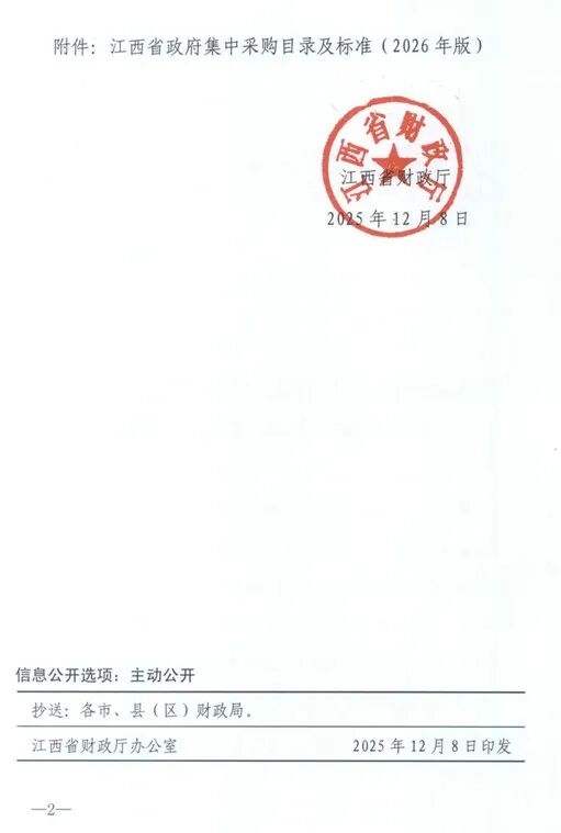 日前,为进一步深化政府采购领域制度改革,优化集中采购管理,提高政府采购质效,江西省财政厅印发《江西省政府集中采购目录及标准(2026年版)》,自2026年1月1日起实施。